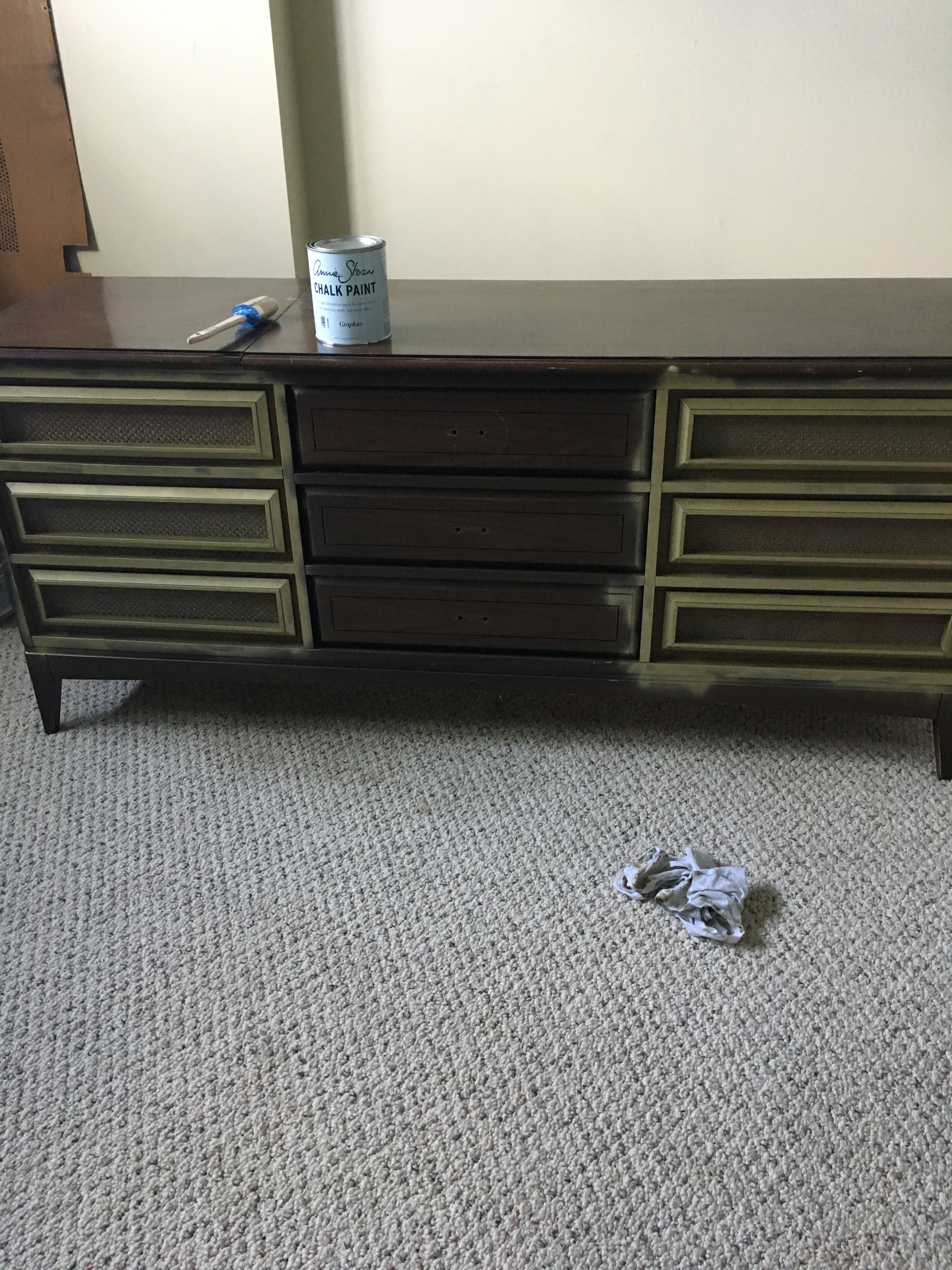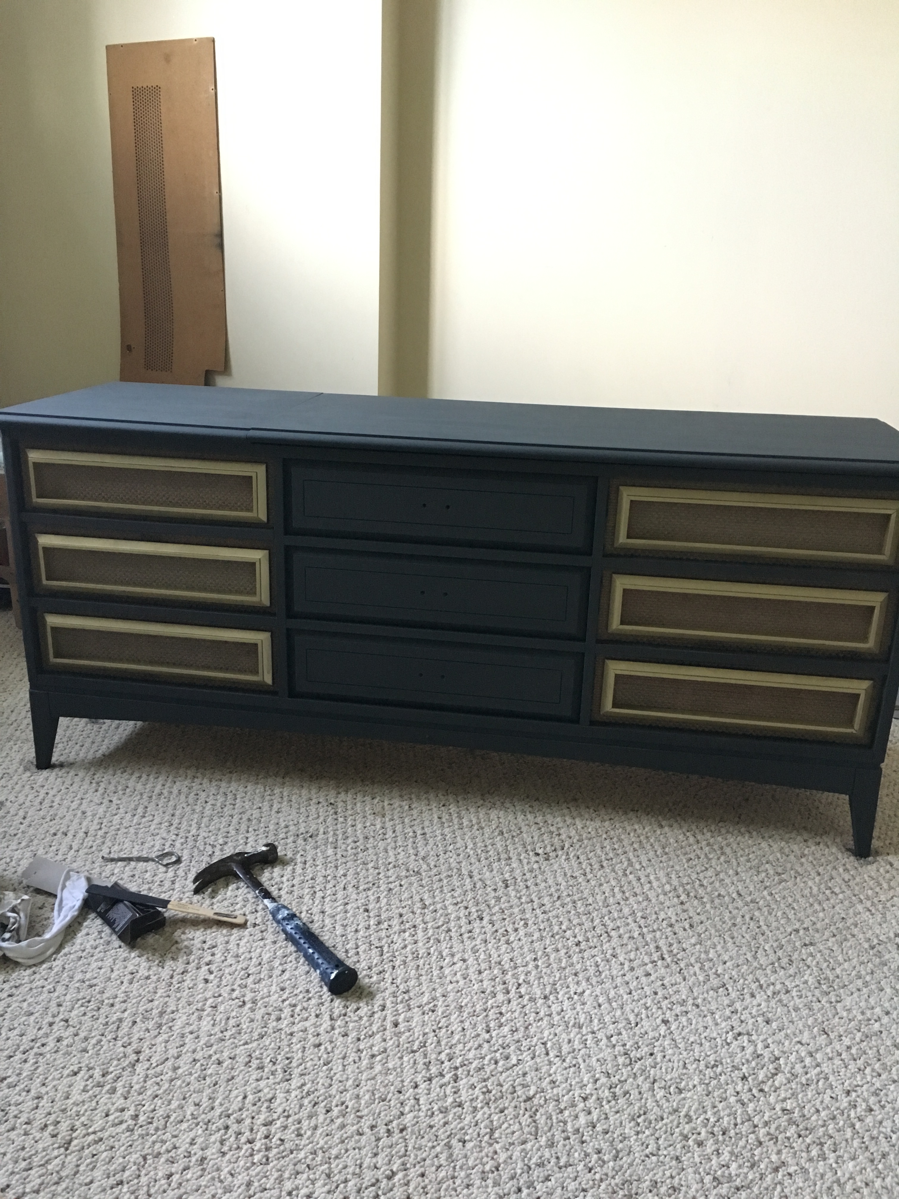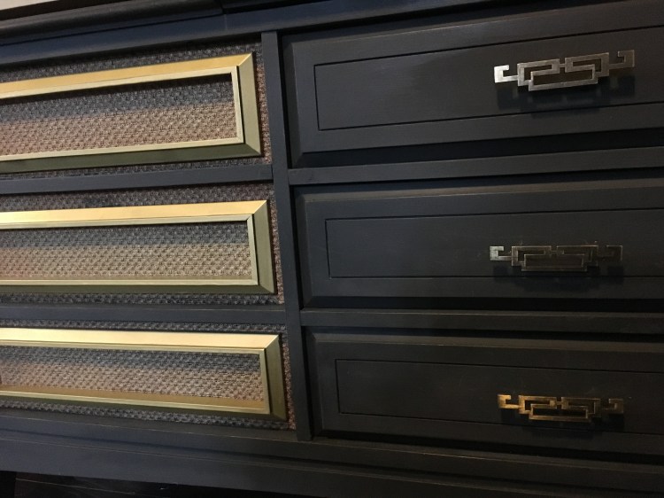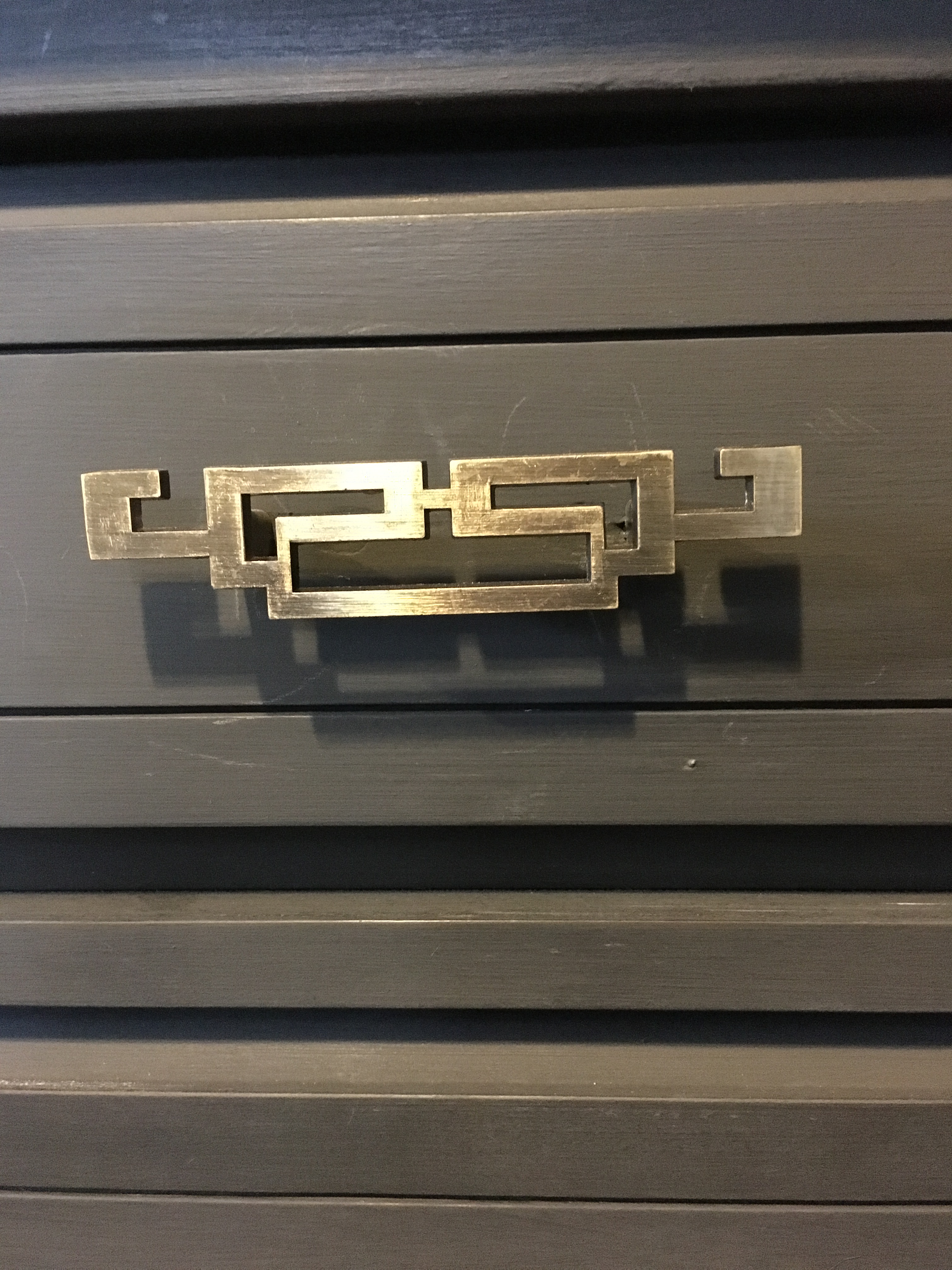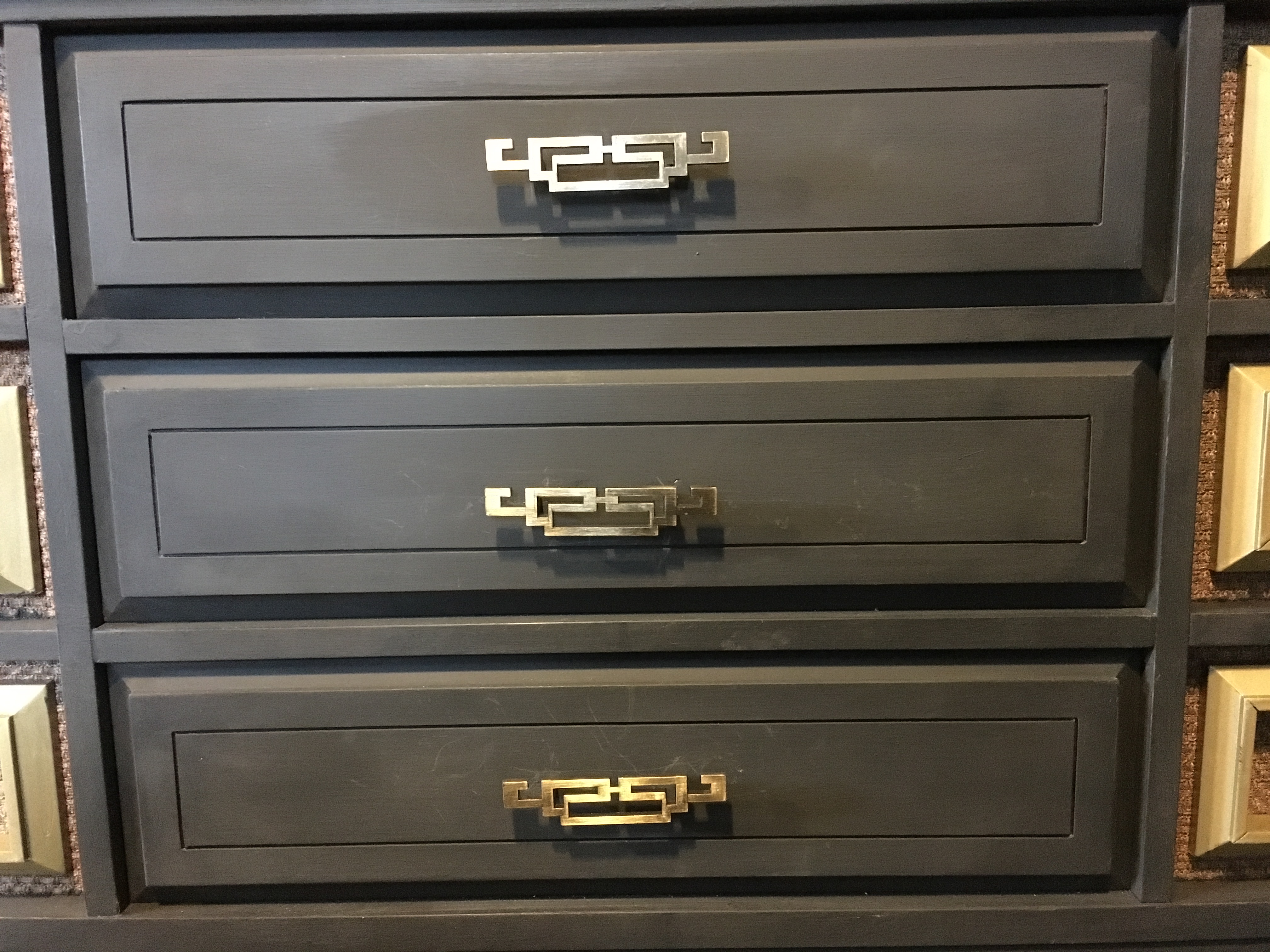 Chalk paint was my go to as the cabinet has a laminate type coating on it and I really didn’t want to sand it (chalk paint sticks to almost any surface). I went to our local Paint Annie Sloan Chalk Paint dealer J’Adorn, and after taking some samples, I chose the colour Graphite (which is a navy blue/grey/black). My plan was to accent the piece with a matte bronze/gold.