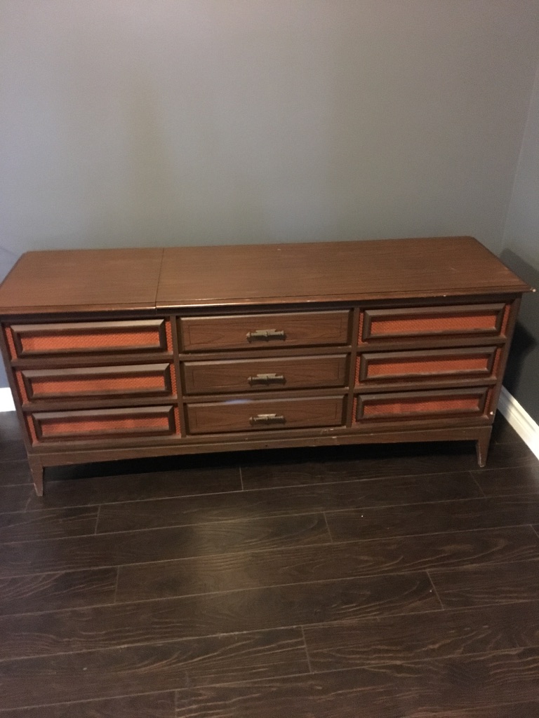 After inheriting the record player, the one issue that I had, was that we didn’t have a space for the record player to sit on. It just didn’t look right anywhere we put it. So, when I was pregnant last year, I found this vintage stereo console on our local swap and sell Facebook group. I knew exactly where this would go in our basement and envisioned a chalk paint make over for it as I envisioned I’d have ALL this extra time while I was on maternity leave (ha)! Regardless, I needed to have it! The woman selling it wanted $50 but I managed to get it for $30 as the only thing that worked were the speakers.